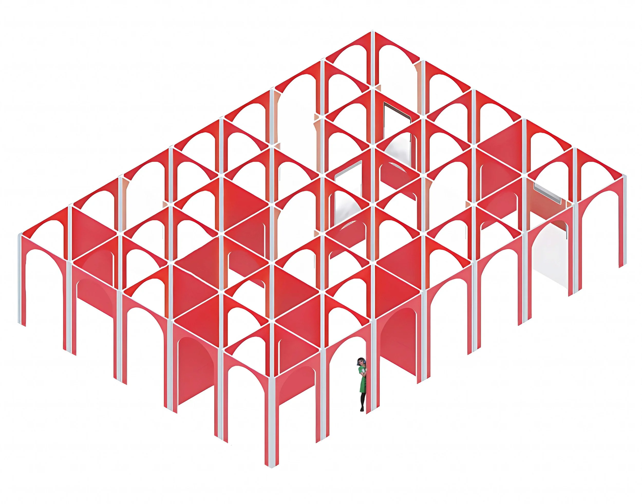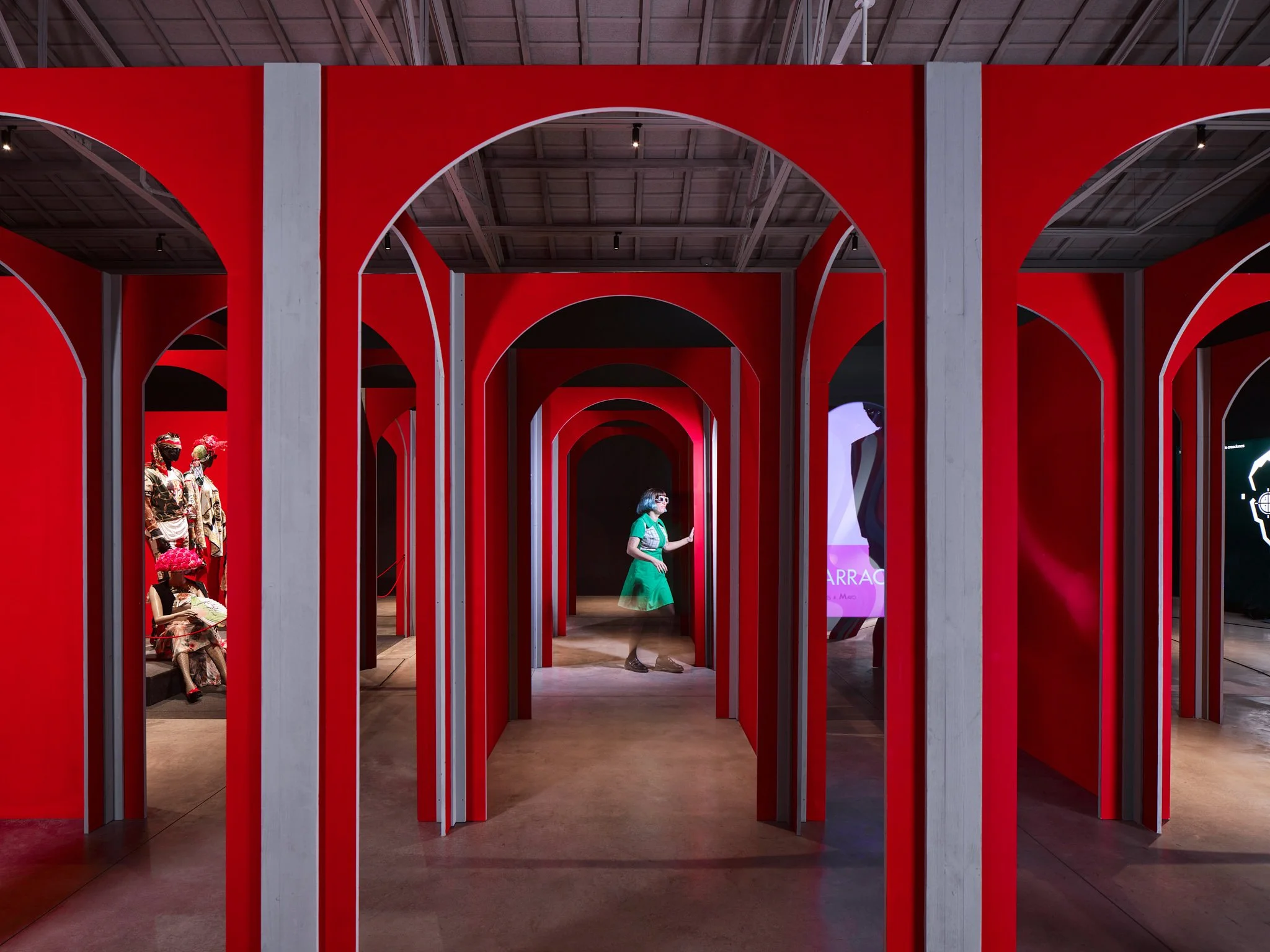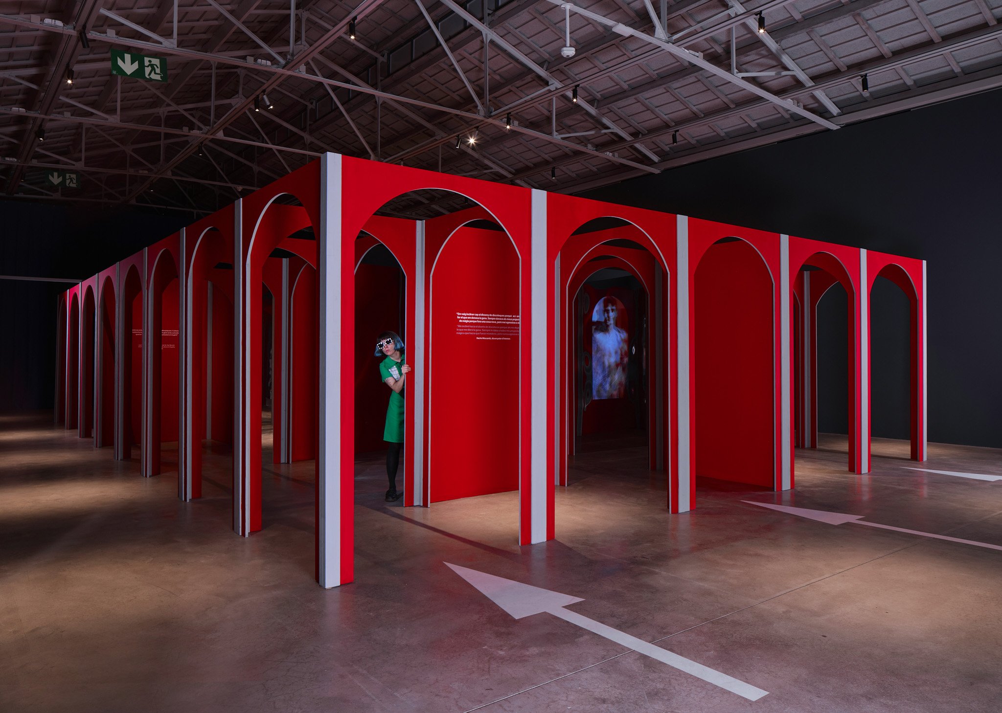 Las referencias arquitectónicas para la solución de la geometría remiten, sobre todo, a construcciones que generan paisajes laberínticos y fractales mediante la repetición de elementos. El espacio adopta los colores de señalética de parking que guían la exposición y el rojo domina la escena, simbolizando excitación, peligro y deseo. Los espejos que confunden y multiplican el espacio, las pantallas ocultas tras espejos espía que reproducen cápsulas de vídeo, así como las instalaciones artísticas en su interior, convierten este laberinto multicursal en un juego inconcluso de creatividad y referencias cruzadas.