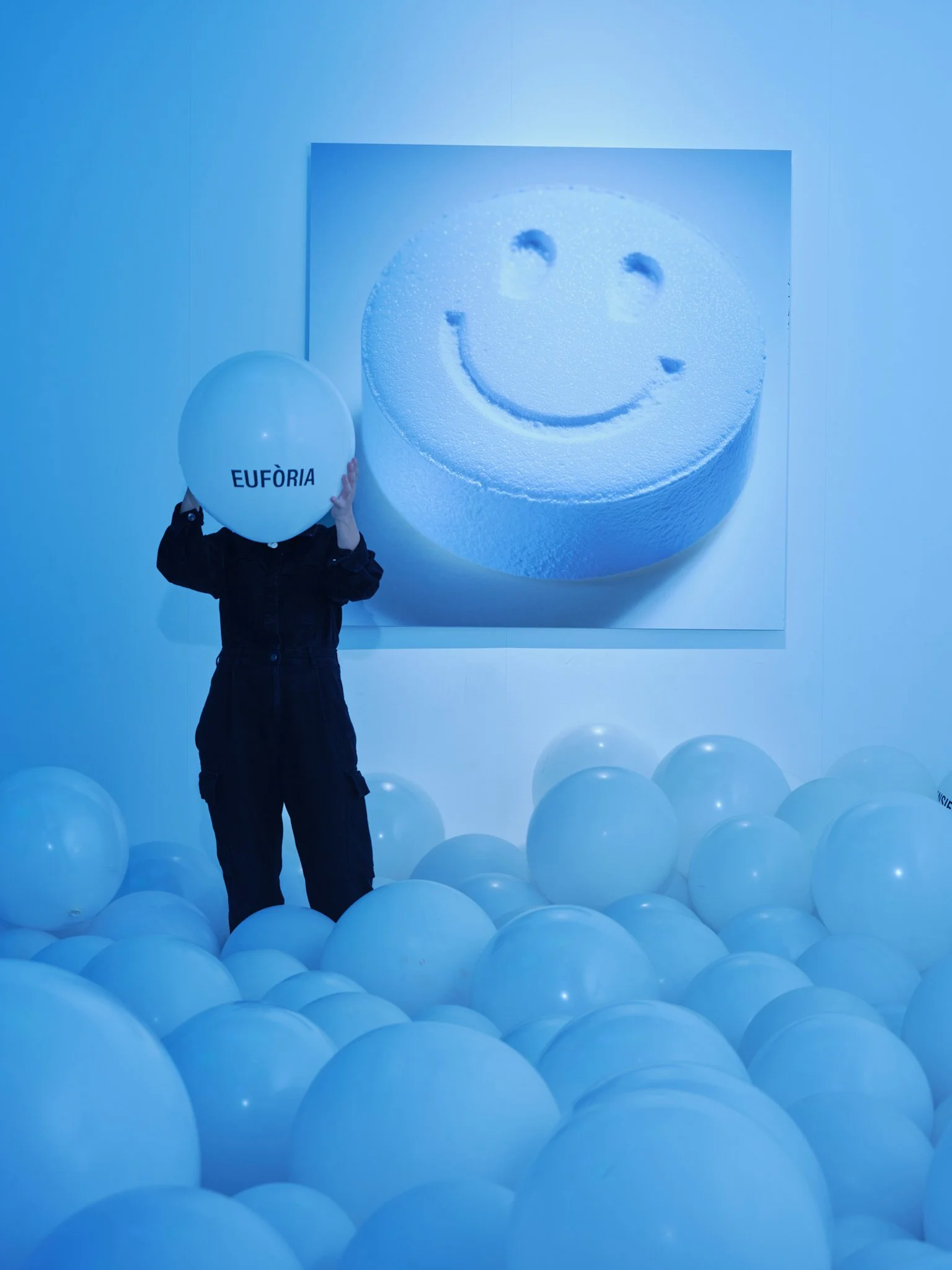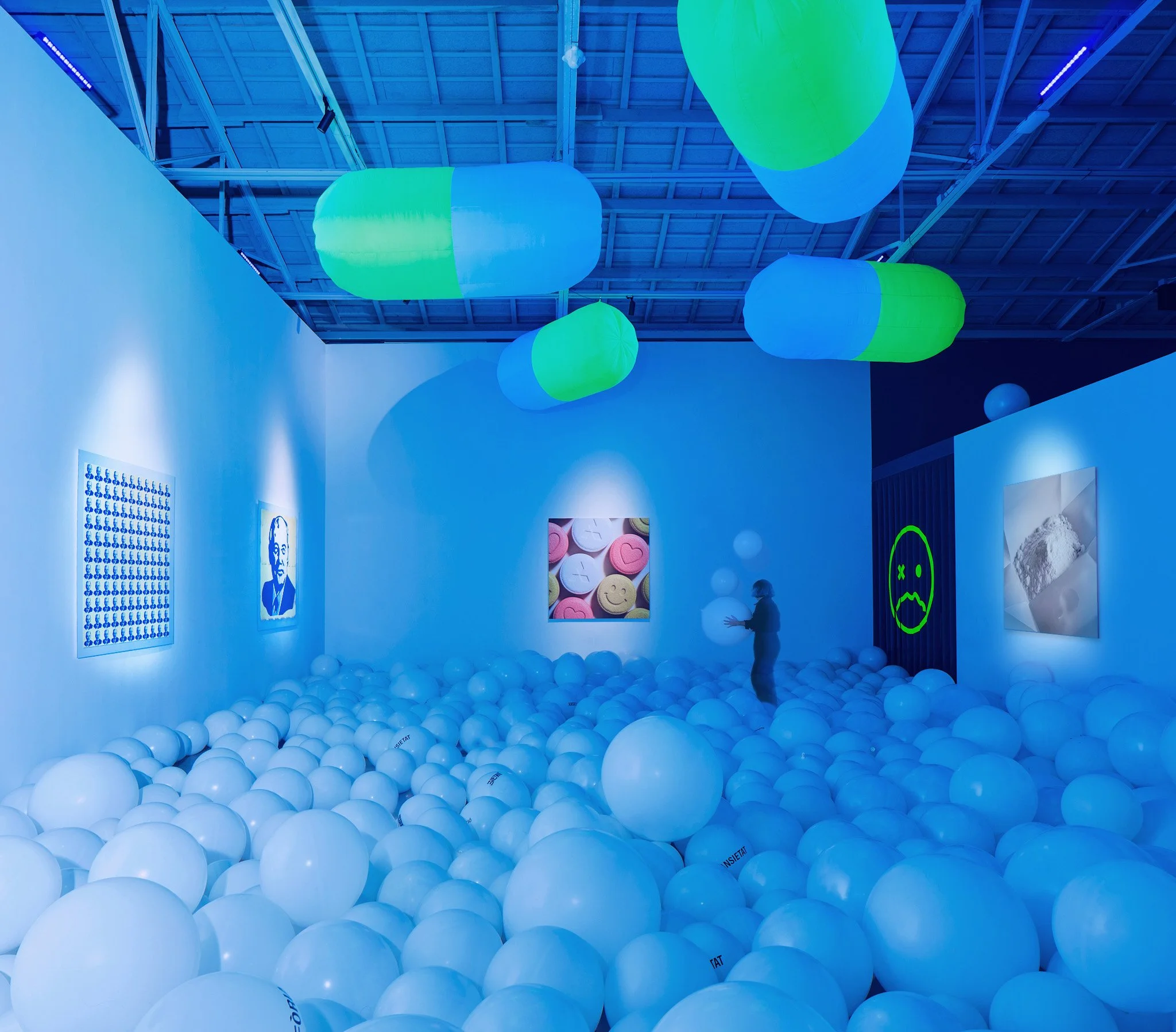 La luz negra transforma los globos blancos que inundan el espacio en esferas azuladas, que incluyen rótulos de los efectos (positivos y negativos) de las sustancias que, a modo de galería de cuadros químicos, se encuentran en las paredes. A su vez, en el techo flotan grandes globos verdes, metáforas de cápsulas de mescalina —la droga emblemática de esta historia—, cuya fórmula permanece en secreto. La escena se encuentra delimitada por dos cortinas verdes de plástico de laboratorio que incluyen los iconos que utilizó la campaña “Si te pasas, te lo pierdes” desarrollada por la ONG Controla Club en colaboración con la Generalitat Valenciana el año 2009. El juego se cierra con un gesto final: los globos —tan suaves y divertidos al principio—, al final estallan, liberando las emociones y delirios que habían contenido.