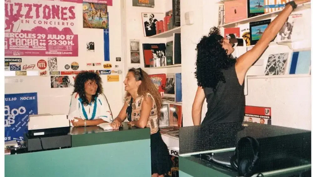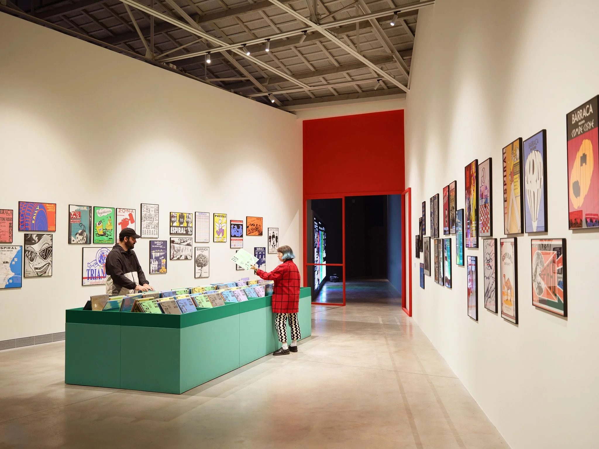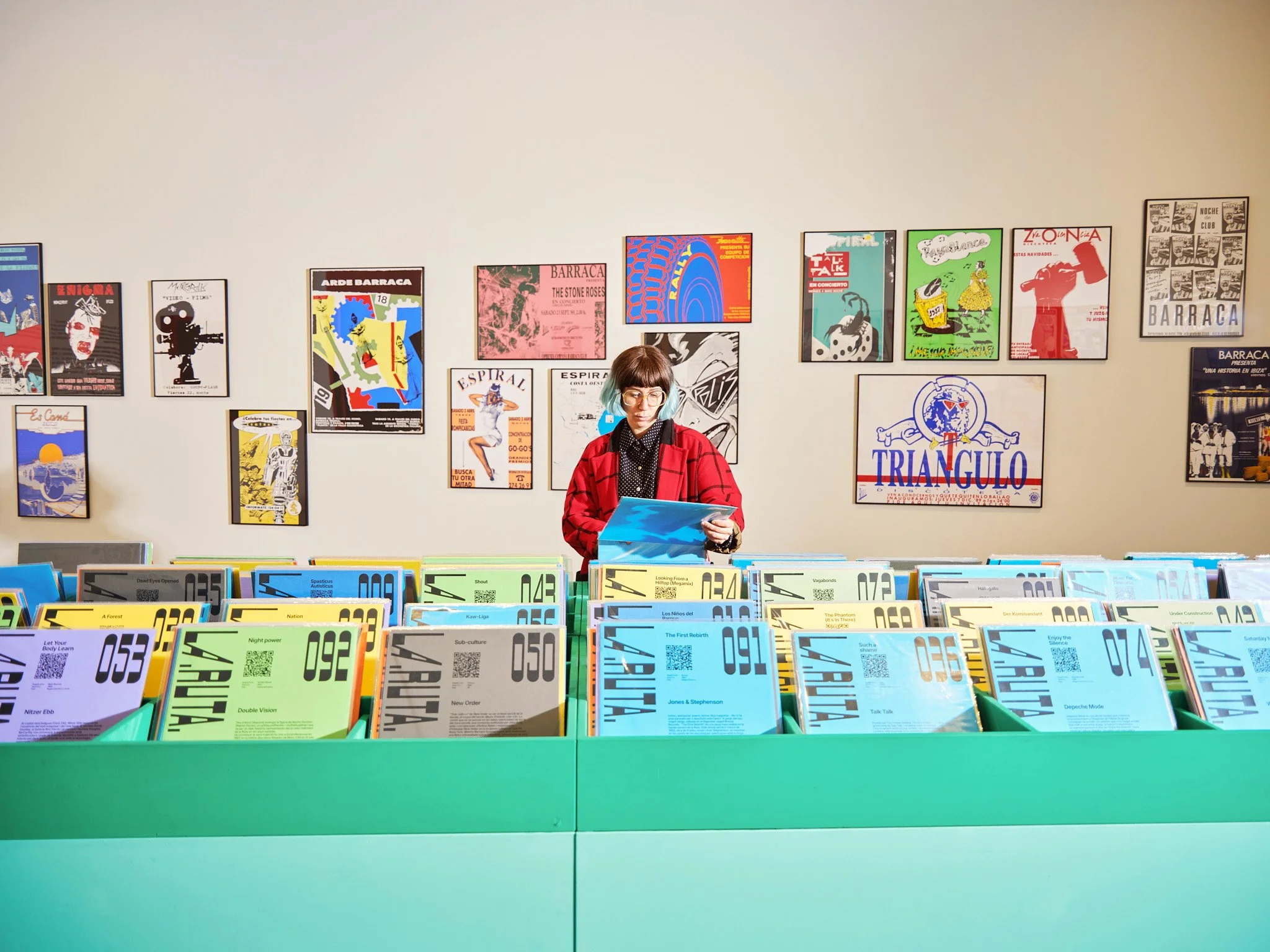 Este espacio recrea la atmósfera interior de una tienda de vinilos: con un mueble de discos central y paredes llenas de cartelería original de la época. Los carteles están dispuestos de forma intencionadamente caótica, evocando el carácter espontáneo y vibrante de aquellas tiendas de discos. Dos grandes puertas de acceso y salida, concebidas como iconos visuales, marcan y delimitan este ambiente más cálido dentro del recorrido. La colorimetría mantiene el rojo dominante de esta zona de la exposición, incorporando dos tonalidades de verde-tráfico que son un guiño al color del mobiliario que había en la mítica tienda de discos de importación Zic-Zac, lugar imprescindible para entender la efervescencia musical de aquella época.